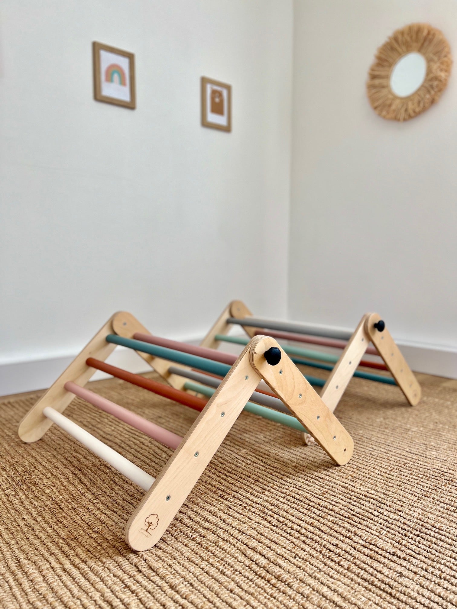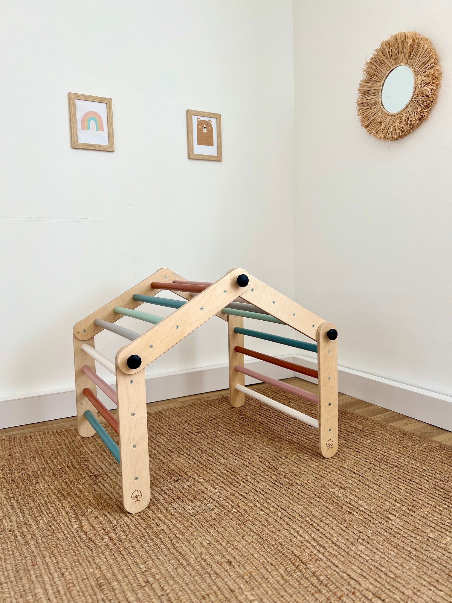 Climbing Triangle for Kids - Darker wood with pastel bars