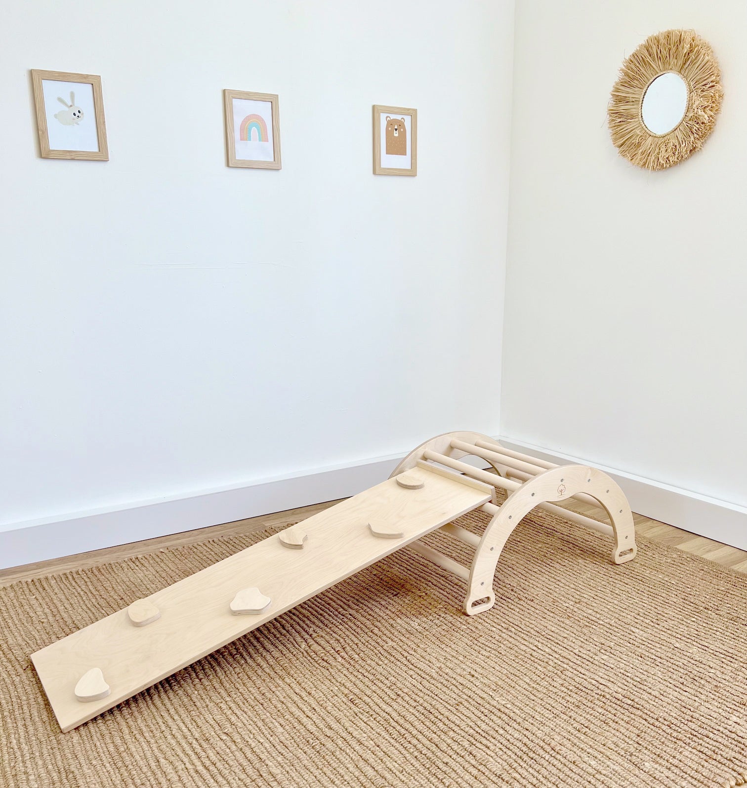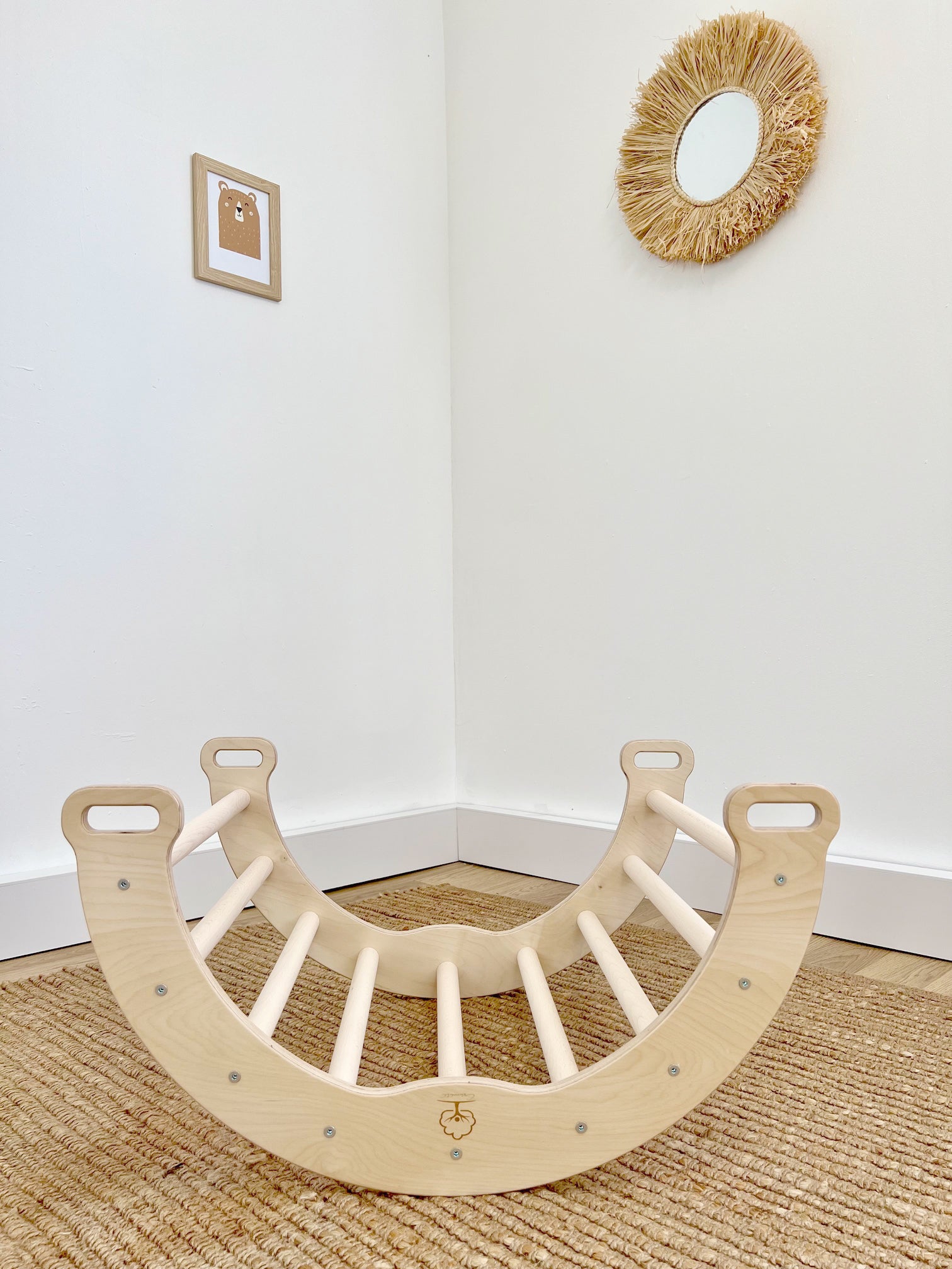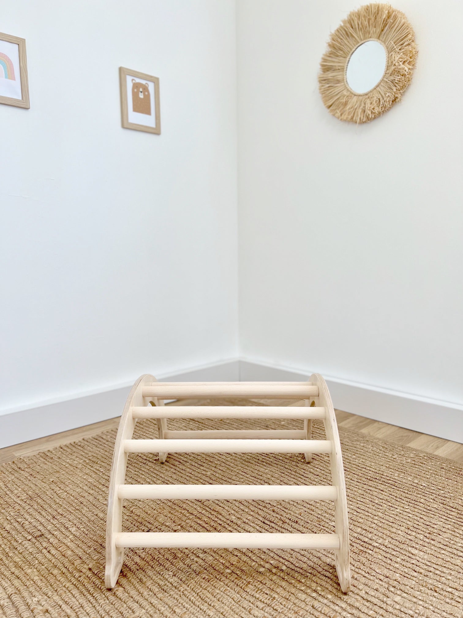 You can encourage little ones to reach forward and upward by placing an exciting toy on one of the rainbow bridge’s bars. It also serves as a climbing board, allowing them to climb over and balance across, thereby strengthening the arch of the foot while fostering concentration and spatial awareness. It can also be used as a tunnel to crawl underneath, which encourages children to plan their movements. For imaginative play, they can sit cross-legged and rock gently from side to side or back and forth. You can also cover it with a blanket to create a cosy hideout. Or, they can add a pillow and turn it into a comfortable cradle.